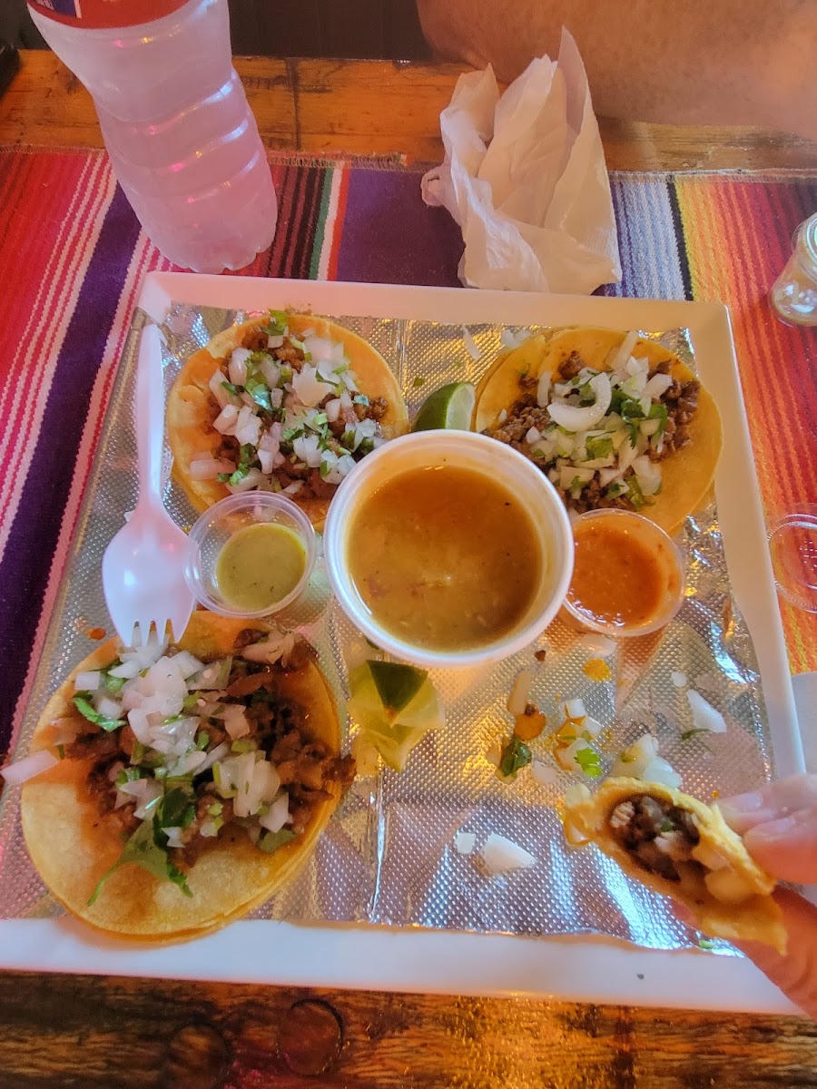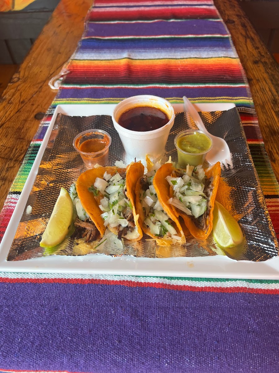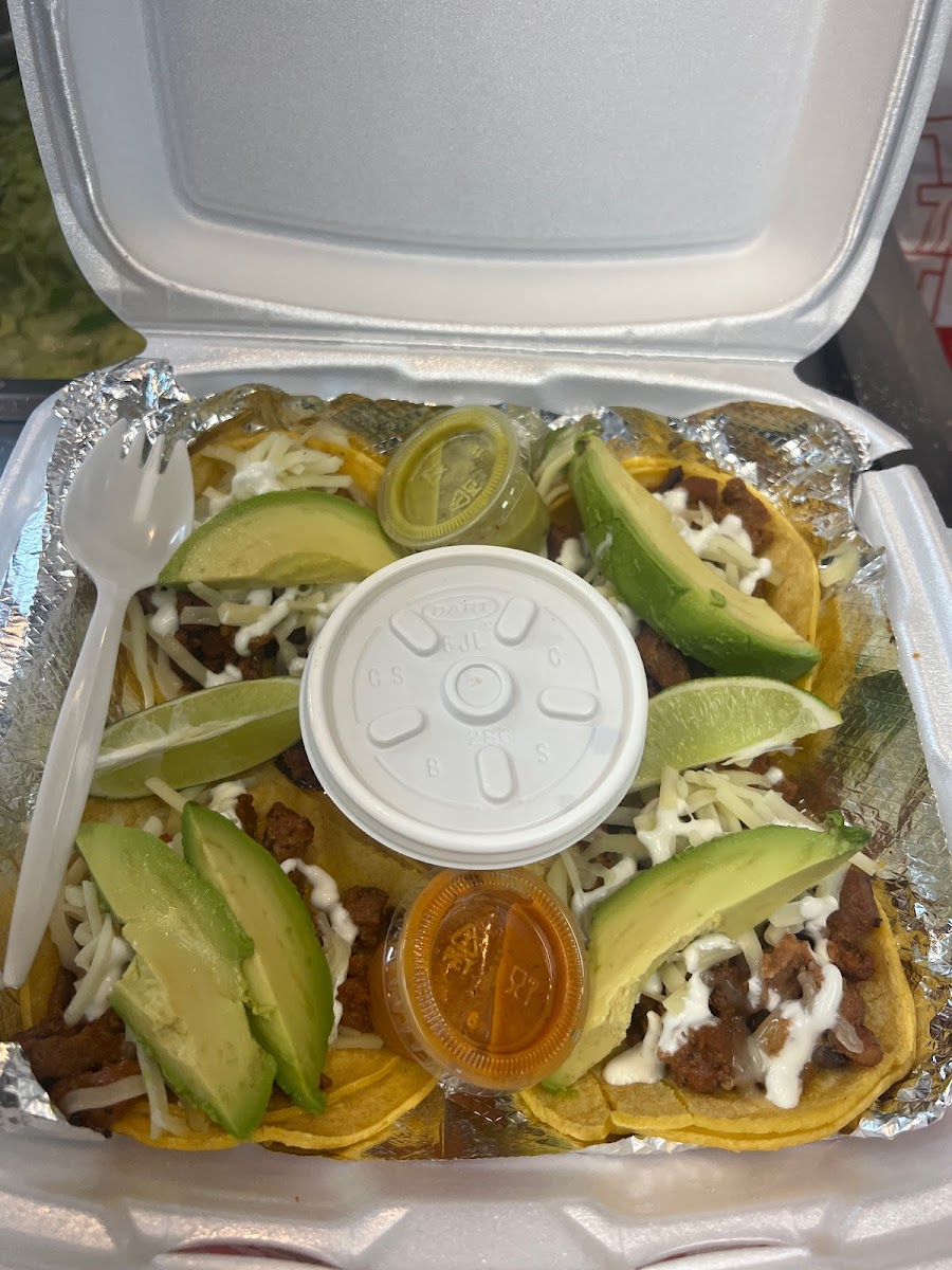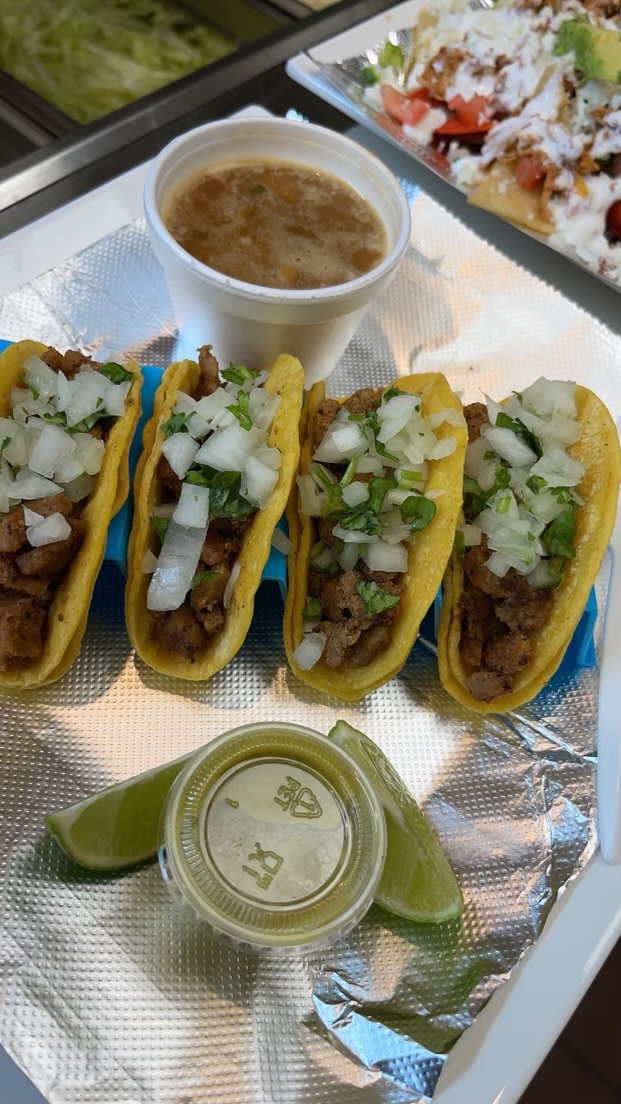 (4) Corn tortillas with your choice of Carne Asada (Beef), Pastor (Pork), Pollo (Chicken), topped with Cilantro and onion vegan options: Plant Based Chorizo c.p.a. (Cheese, Pico, Avocado).